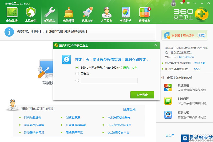 進入系統(tǒng)修復,如下圖所示,會提示瀏覽器主頁猥瑣帝,可能免費主頁被木馬惡意篡改的風險,建議立即鎖定。
