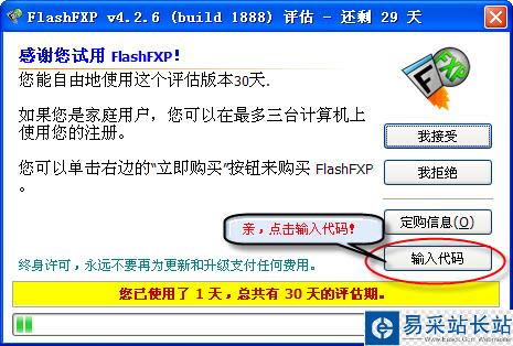3、打開(kāi)flashfxp.exe,出現(xiàn)試用窗口,點(diǎn)擊輸入代碼:
