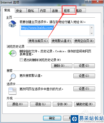 3、在Internet選項對話框中,點擊程序選項卡,如下圖所示。