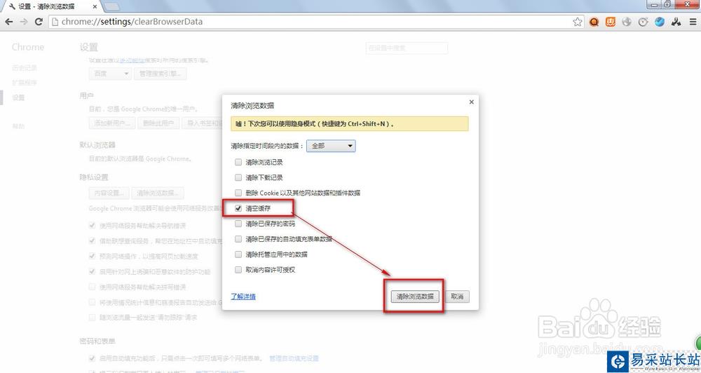 選上 清空緩存,然后點擊 清除瀏覽數(shù)據(jù) 按鈕即可。