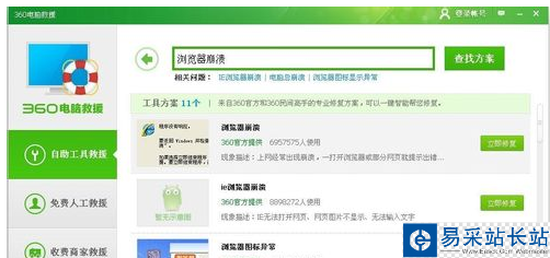 方法四:修復360瀏覽器一是可以使用瀏覽器自帶的瀏覽器醫生功能進行修復,點擊瀏覽器醫生,選擇一鍵修復即可。二是使用360安全衛士的360電腦救援功能,打開電腦救援,輸入“瀏覽器崩潰”,即可出現各種瀏覽器崩潰問題的修復功能,點擊修復就行了。