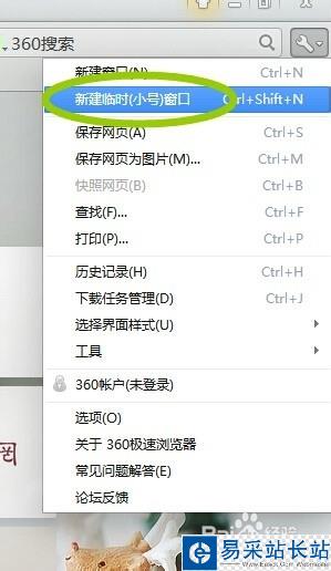 3、然后選擇【新建臨時(shí)(小號)窗口】選項(xiàng),打開窗口頁面。看下圖所標(biāo)示選項(xiàng)