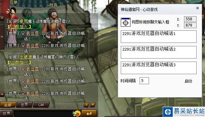 打開游戲后 將圖標拖入聊天輸入框 設(shè)定喊話內(nèi)容和時間間隔 點擊啟動 即可開始自動喊話