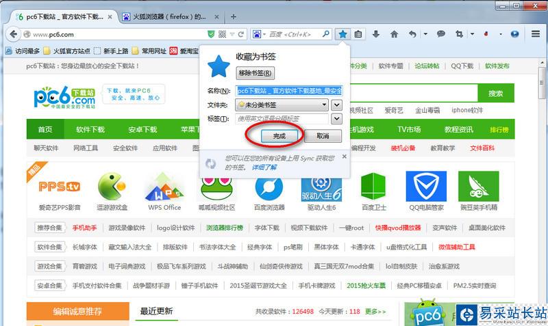 2、然后我們點(diǎn)擊這個(gè)“收藏”工具按鈕,會(huì)彈出收藏為書簽對話框點(diǎn)擊“完成”。