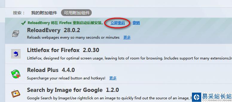 4、在搜所欄輸入reloadevery,然后找到這個組件點擊“安裝”,再點擊“立即重啟”(此處重啟只重啟火狐瀏覽器)然后重復步驟1和步驟2.