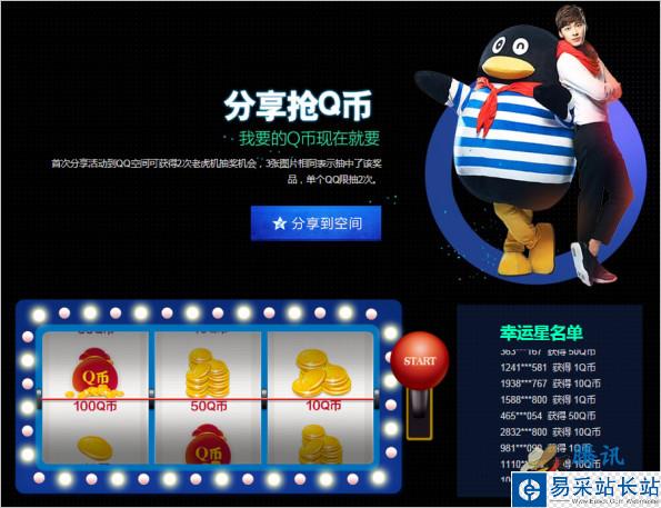 首次分享活動到QQ空間可獲得2次老虎機抽獎機會,3張圖片相同表示抽中了該獎品,單個QQ限抽2次。