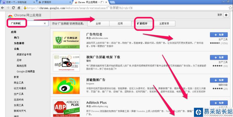 3、進入網上應用店之后,我們在左邊搜索欄里,搜索“廣告屏蔽”,右邊結果里,在擴展程序里尋找,適合我們自己的一款應用就可以了