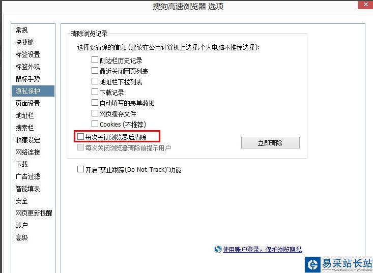 步驟二:進入“搜狗高速瀏覽器選項”找到”隱私保護選項“在右側可以看到“每次關閉瀏覽器清除”我們把他打勾,然后點擊“應用”點擊“確定”。