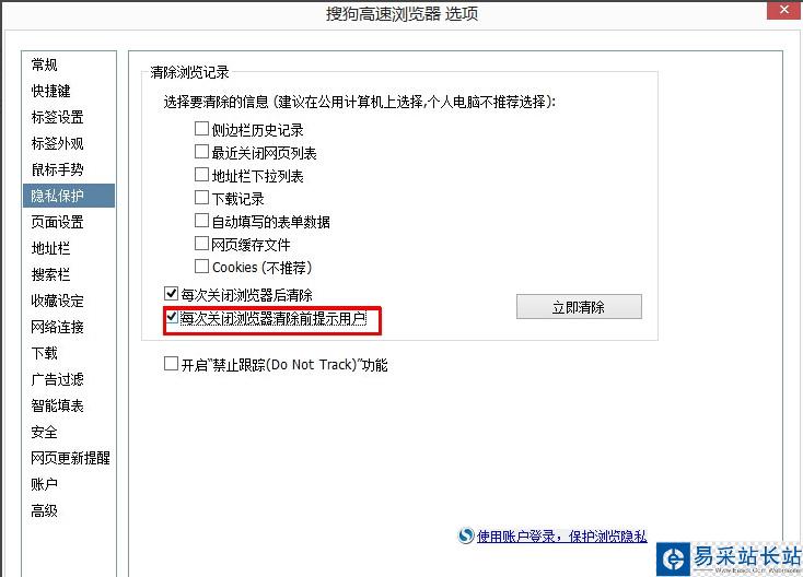 如果你有時候不想清除我們可以勾選下面的“每次關閉瀏覽器清楚提示用戶”
