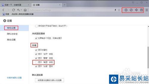 4、設(shè)置界面中,在【常規(guī)設(shè)置】里面找到【外觀】項(xiàng),在【外觀】】項(xiàng)下的【顯示"截圖"按鈕】前面打勾,截圖按鈕就會(huì)出現(xiàn)在工具欄了,如圖所示: