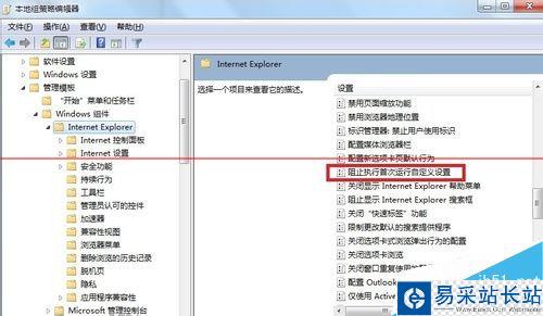 5、雙擊“Internet Explorer”后找到右邊的窗口中的“阻止執行首次運行自定義設置”,雙擊它。