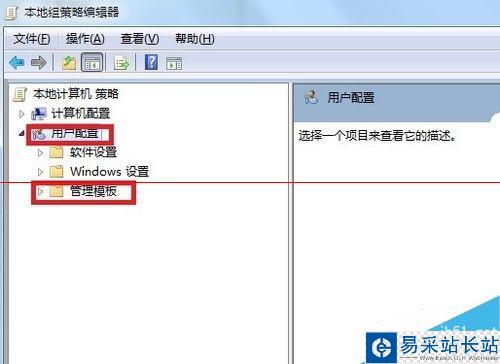 2、在“本地組策略編輯器”左側找到“用戶配置”下的“管理模板”。