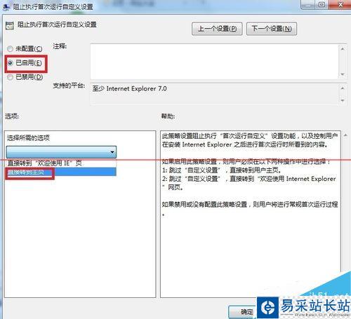 6、雙擊“阻止執行首次運行自定義設置”后出現新窗口,如圖選擇“已啟用”和“直接轉到主頁”應用,確定,就ok了。