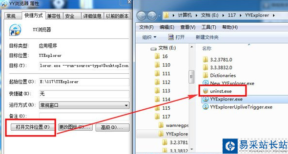 方法三、我們右擊yy瀏覽器圖標==“屬性”==“打開文件位置”==點擊“uninst.exe”;
