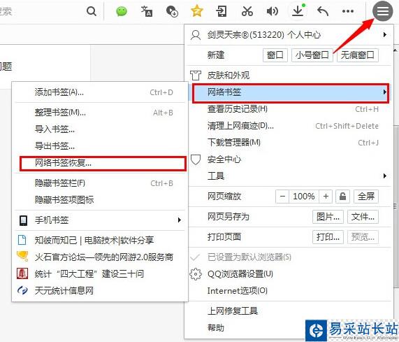 您可以點擊菜單中的第四個選項網絡書簽,然后選擇網絡書簽恢復即可恢復您的一部分書簽