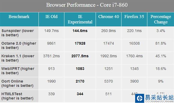 AnandTech網站也對開關新引擎后的Windows 10 IE11進行了一番對比測試,并參考了Chrome、Firefox這兩個備受贊譽的瀏覽器。