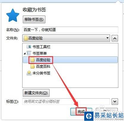 6、接下來我們將網(wǎng)頁添加到分類書簽中,打開網(wǎng)頁,點擊瀏覽器的【收藏】按鈕,選擇書簽分類后點擊【完成】,如圖所示: