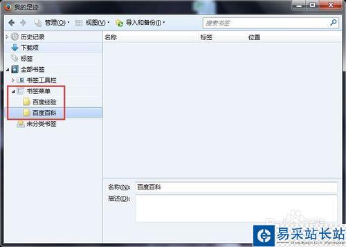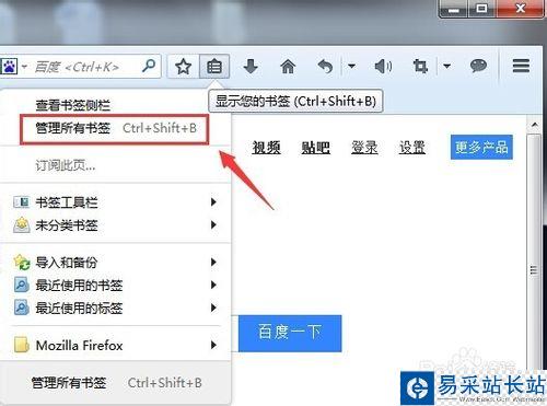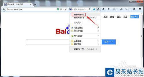 3、在書簽下拉菜單中選擇【管理所有書簽】,進入書簽管理界面,如圖所示: