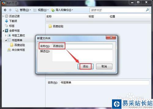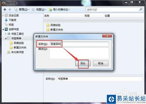 5、選中【書簽菜單】,點擊右鍵,右鍵菜單點【新建文件夾】,修改【名稱】后,點擊【添加】,這里添加了兩個文件夾即兩個書簽分類,如圖所示: