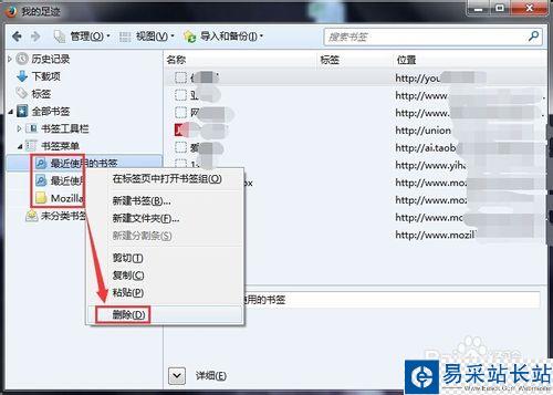 4、在書簽管理界面中,將【書簽菜單】下火狐默認推送的書簽全部刪除,選中書簽,點擊右鍵,右鍵菜單點【刪除】即可,如圖所示:
