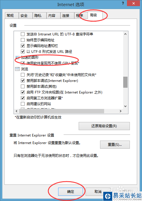 3、在打開的internet選項卡中,找到“加速的圖形”選項,勾選下面的“使用軟件呈現而不使用GPU呈現”項,確定保存后,重啟下瀏覽器即可。