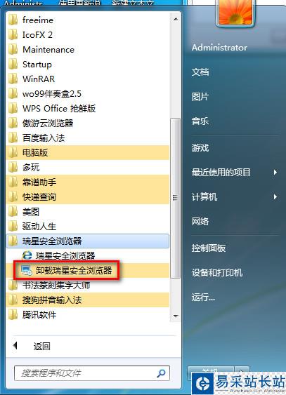 2、我們可以點(diǎn)擊開始菜單==卸載瑞星安全瀏覽器