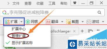 2、然后就會在收藏夾的右側(cè)看到一些之前安裝過的插件,我們點擊最左側(cè)“擴展”下的三角下拉按鈕,然后選擇“管理插件”