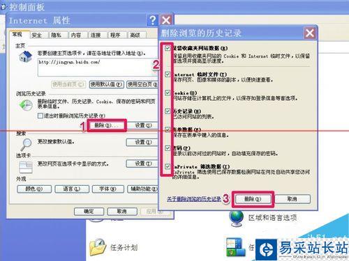 8,設置好緩存文件夾后,最好先給緩存文件夾來一次清理,方法,選擇“刪除”按鈕,點擊進入“刪除歷史記錄”窗口,勾選所有的項,按“刪除”按鈕即可清理緩存文件夾。