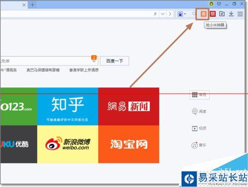 1、首先下載安裝百度瀏覽器,打開(kāi)百度瀏覽器,在右上角集成了搶小米、搶火車(chē)票的功能插件。