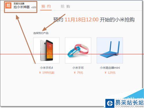 6、到了第小米的開(kāi)放購(gòu)買(mǎi)日,我們?cè)俅蜷_(kāi)百度瀏覽器,點(diǎn)擊“搶”圖標(biāo),提前30分鐘,可以激活搶購(gòu)插件,設(shè)置自動(dòng)搶購(gòu)。