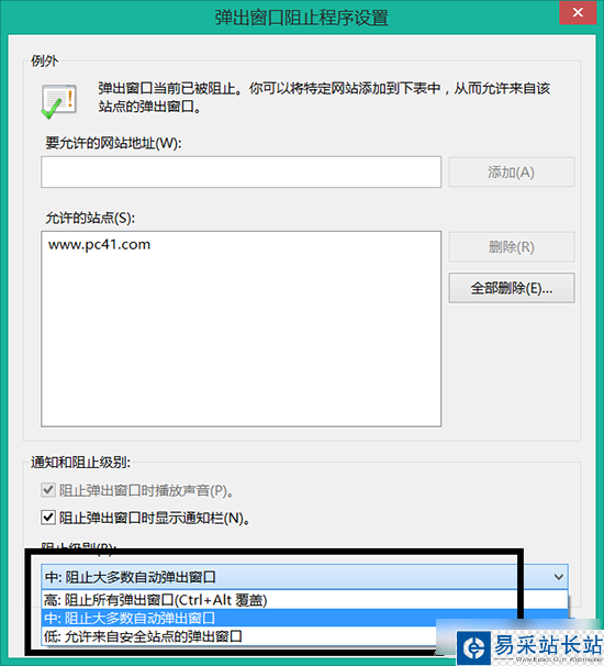 沒有添加進去的網站就會根據下面的阻止安全級別來自動判斷是否彈窗。一般默認的級別為中:阻止大多數自動彈出窗口,設置高:則會阻止所有的,設置低:則開放來自安全站點的彈出窗口,這三個級別根據自己的需要來設置就好了。