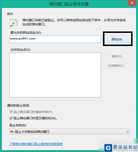 這里有設置,非常實用,可以添加你允許需要開放權限的網站,還可以阻止的安全級別設置。在“允許的地址”欄輸入該網站地址,點擊旁邊的添加按鈕,網站就添加進去了。以后該網站所有的需要彈出窗口的程序功能都能打開,如圖所示。