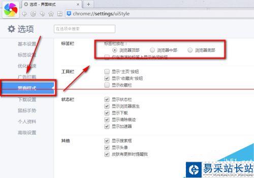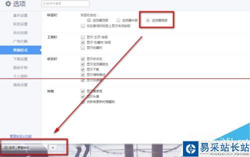 4、在界面樣式中第一行有標簽欄位置,在瀏覽器底部前面的圈內打上勾即可