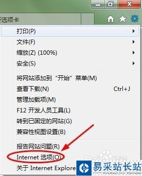 點擊以后會彈出一個下拉窗口,我們選擇其中最下端的"Internet選項",然后就會彈出一個對話框,如圖