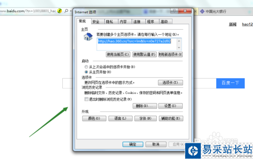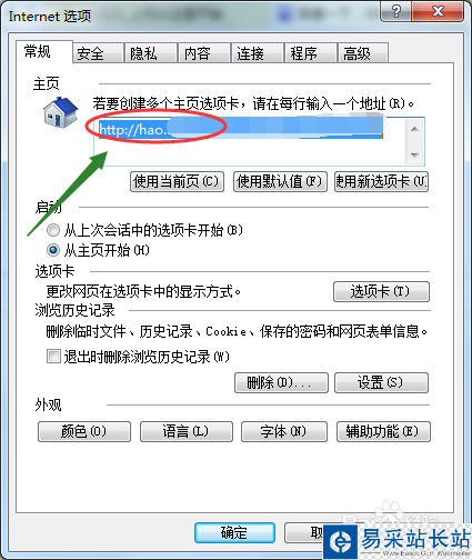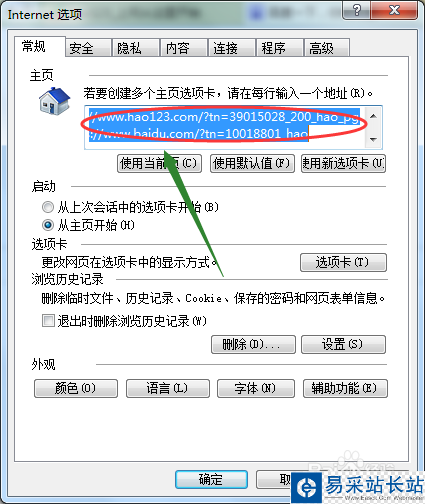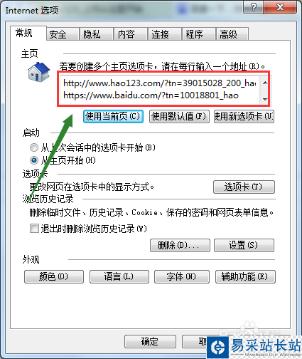 在該對話框常規下目前顯示的是我們IE瀏覽器的主頁,我們連續點擊下面的"使用當前頁",然后就可以列出當前我們所有打開的網站地址,見下圖