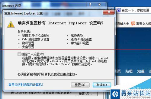 5、故障仍未修復,就要出大招了,在剛才的菜單中選擇偏下方的重置IE設置選項,IE將重置所有配置,基本上的瀏覽器問題都可以通過這種方式解決。