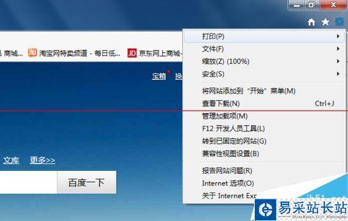 2、打開IE后,選擇右上角的設置圖標,選擇internet選項,如果IE無法打開,通過控制面板-網絡與Internet-internet選項進入。