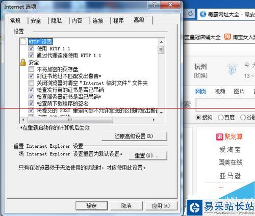 4、如果上述方案不生效,選擇internet選項中的高級屬性,如下圖所示,然后選擇還原高級設置,確定后重啟IE確認故障是否消失。
