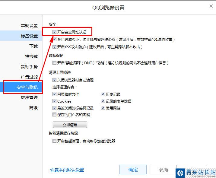 3、進入“安全與隱私”==開啟安全網址認證==點擊確定