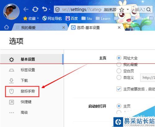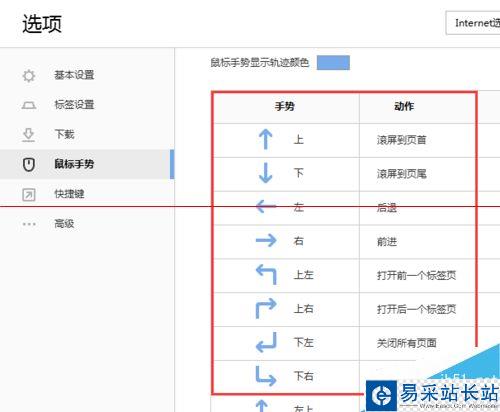6、設置【手勢】,瀏覽器已經默認設置了很多手勢了,大家可以根據個人習慣更改哦