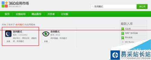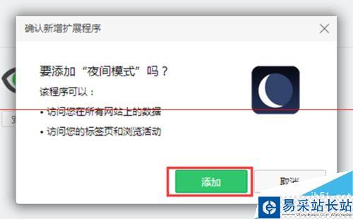 3、在打開的應(yīng)用市場(chǎng)中,搜索“夜間模式”,找到兩款插件,我們選擇第一款,安裝。彈出框中點(diǎn)擊【添加】。