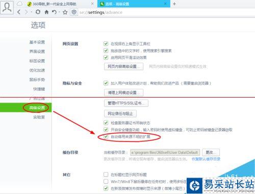 3、在【選項】界面下,點擊選擇【高級設置】--勾選【自動停用來源不明的擴展】選項完成設置。(如圖所示)