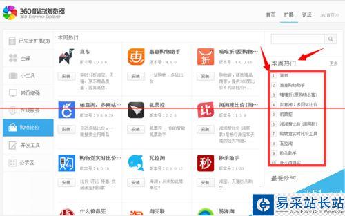 3、進入擴展中心后,看到有很多功能插件可供選擇,根據(jù)你的喜好進行選擇。我們這里主要是進行優(yōu)質(zhì)購物的,所以點取左邊界面的購物比價一項,如圖: