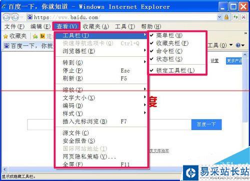 1、發現瀏覽器上沒有搜索框,第一想法,當然是在該瀏覽器本身的設置選項上找出解決方法,先在瀏覽器窗口菜單中尋找,一般設置項會在“查看”與“工具”這兩個菜單中,先打開“查看”看看,里面并沒有“顯示搜索框”的選項。