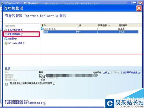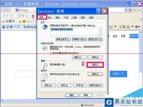 3、進入“Internet 選項”窗口后,在“常規”下,選擇“搜索”這一項,點擊“設置”按鈕,看看里面能不能找到“顯示搜索框”的選項。點擊之后,進入了管理加載項,里面并沒有什么能顯示搜索框的選項。