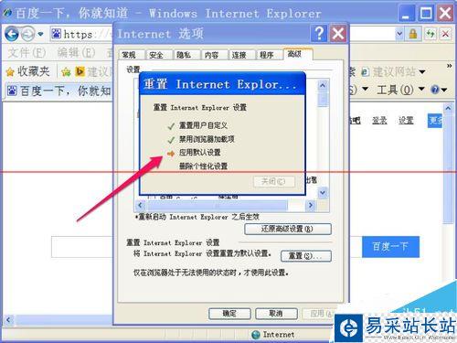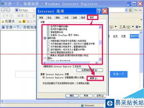 4、退出管理加載項后,再打開“Internet 選項”的“高級”項,進入之后,在“設置”列表中,也沒找到可以顯示搜索框的設置。最后,實在沒辦法了,只好重置整個瀏覽器設置,