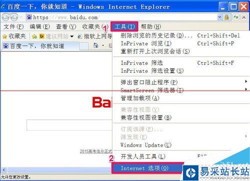2、再到“工具”菜單這一項看看,打開“工具”后,也沒有相關的選項,在IE瀏覽器上,有一個重要的設置項,就是“Internet 選項”,選擇這一項。
