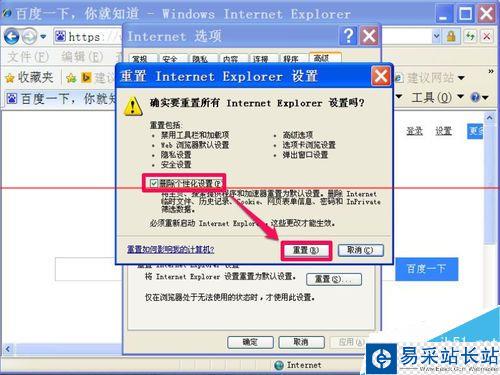 5、進入重置窗口后,里面有介紹要重置哪些項目,提示會將所有的Cookie,表單和密碼信息全部刪除等等,在這里,只有一個設置項,就是勾選“刪除個性化設置”,設置后,按“重置”