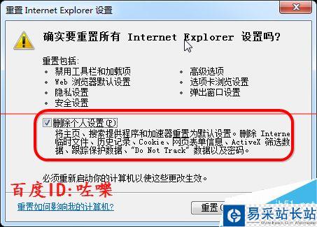 4、重置internet explore設置,注意要勾選【刪除個人設置】