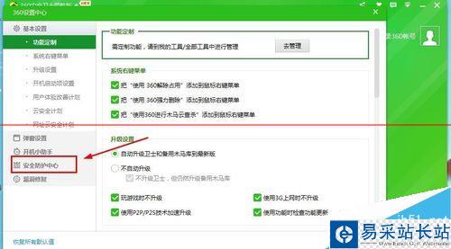 3、點擊設置以后會彈出一個新的窗口,如圖所示。在左側的菜單欄中找到安全防護中心